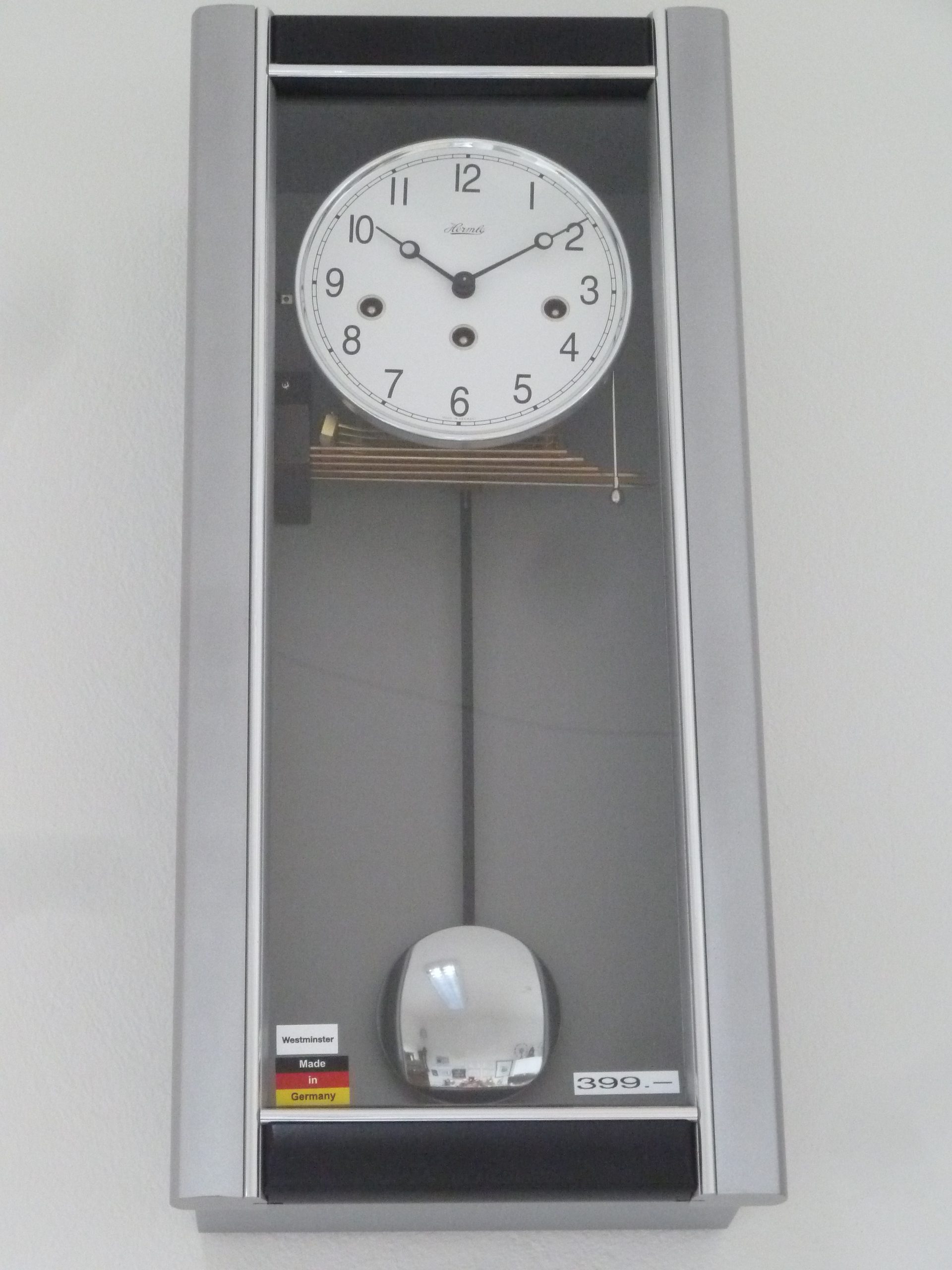 Kleiner moderner Regulator mit Federzug und Westminster Schlagwerk. Farbe Silber und Schwarz.